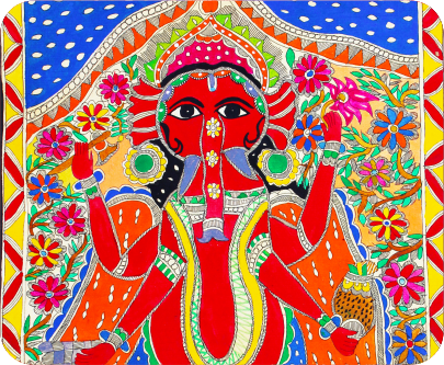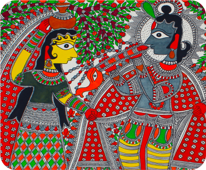 Though Mithila paintings are done by artists all over Mithilanchal and even in the far-off regions of Bihar, villages in district Madhubani like Jitwarpur, Ranti, Raseedpur are more famous for being home to a maximum number of world-famed Mithila Paintings artists. These paintings mainly depict mythological events which mainly revolve around the themes of Hindu deities like Lord Krishna, Lord Rama, Lord Shiva, Goddess Durga, Goddess Lakshmi, Goddess Kali, etc. Madhubani paintings are drawn in accordance with a fixed theme and accordingly, symbols, lines, patterns are drawn. For instance, the symbol fish stands for fertility, good luck, and procreation whereas peacocks usually indicate love, religion, and romance, serpents stand for divine protectors, and so on.