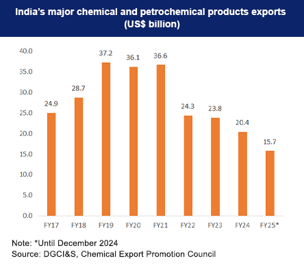 India is among the top chemical exporting countries in the world. India exports inorganic and organic chemicals, tanning and dyes, agrochemicals, plastics, synthetic rubber, filaments, etc. In FY24, the exports of major chemicals and petrochemicals stood at US$ 20.4 billion and in FY25 (April to December 2024) stood at Rs. 1,35,647 crore (US$ 15.73 billion).