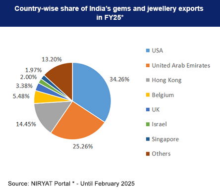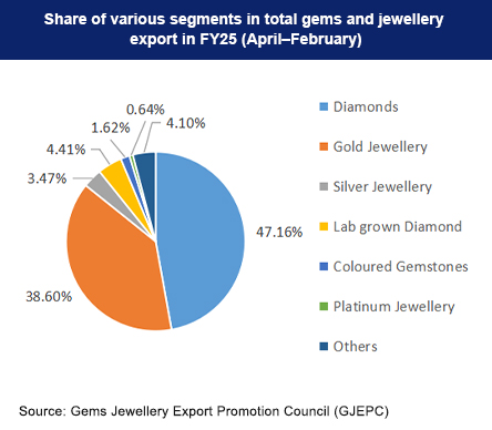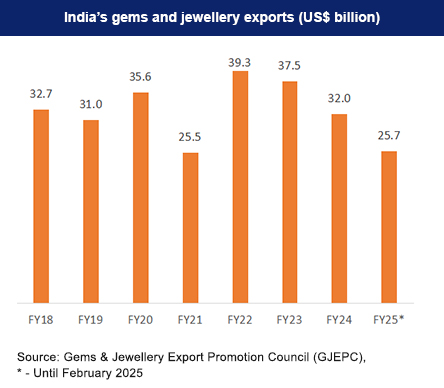 The gems and jewellery industry of India contributes 7% to India's Gross Domestic Product (GDP). The industry employs more than five million skilled and semi-skilled workforces in the country. The sector contributes about 15.71% of India's total merchandise exports, accounting for the third largest commodity share. During FY25 (until February 2025), the gems and jewellery exports reached Rs. 2,17,148 crore (US$ 25.73 billion) with a decline of 11.77% for the same period of FY24.