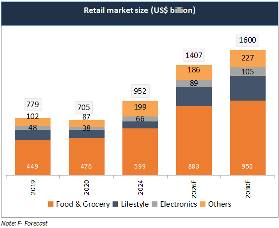*India’s retail sector is on track to exceed Rs. 1,37,10,400 crore (US$ 1.6 trillion) by 2030 from Rs. 81,57,859 crore (US$ 952 billion) in 2024.