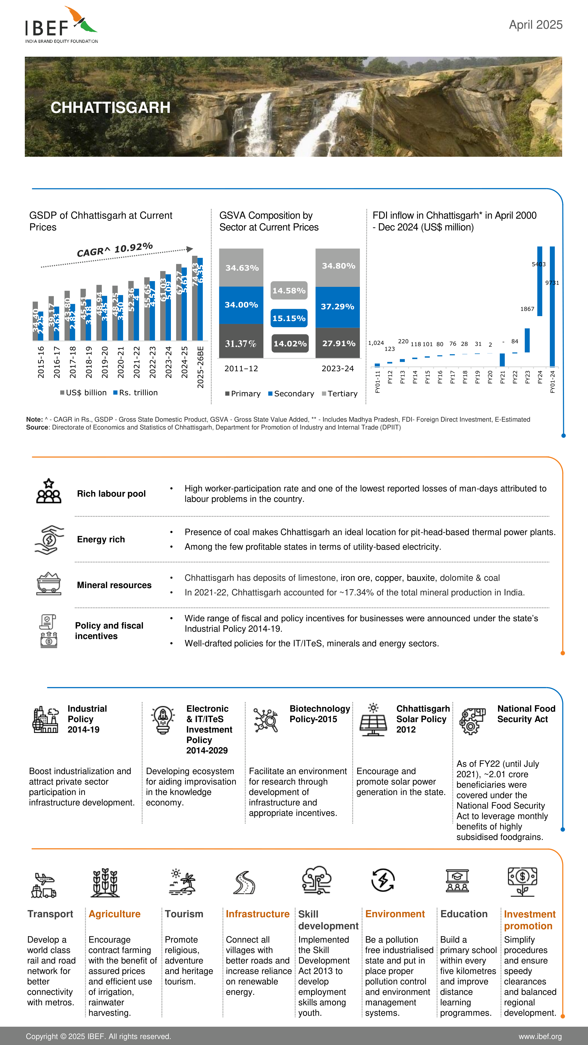 Chhattisgarh earned record revenue of Rs. 12,941 crore (US$ 1.57 billion) from minerals for the year 2022-23 and accounted for more than 17% of total mineral production in India.